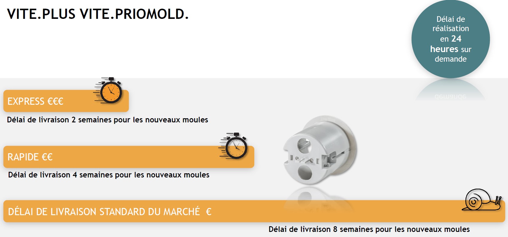 - 4 semaines de délai de livraison standard : ce délai de livraison standard de priomold est nettement inférieur à la moyenne habituelle du secteur.